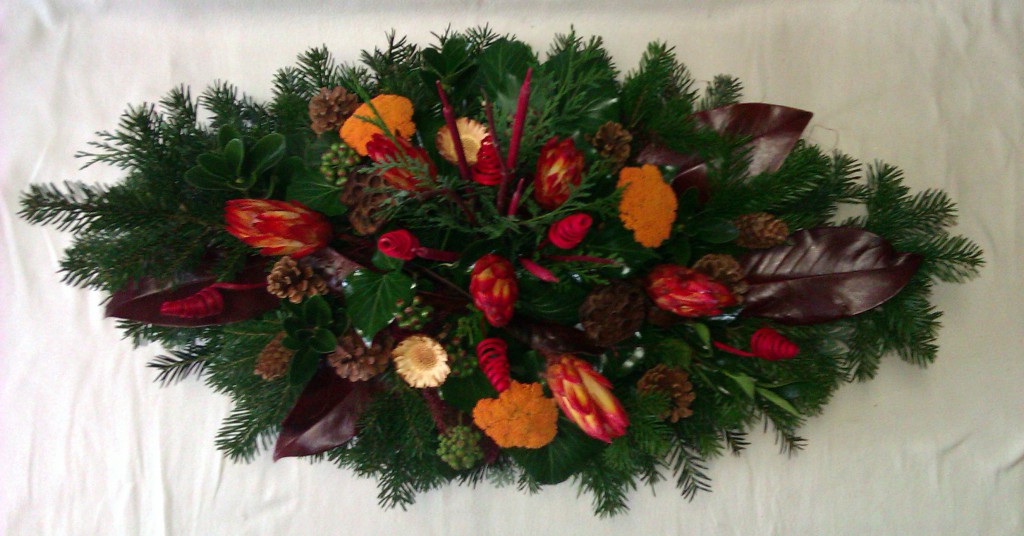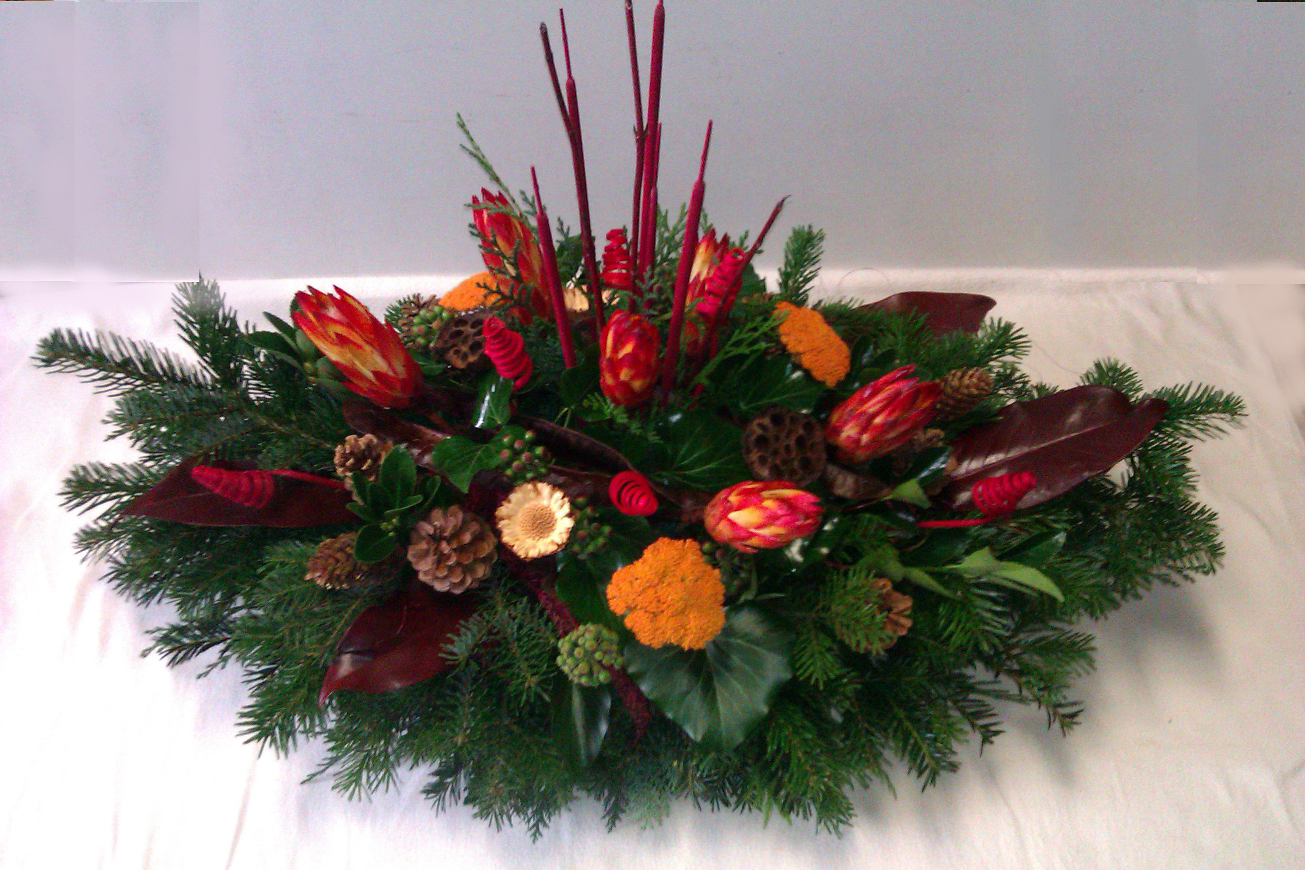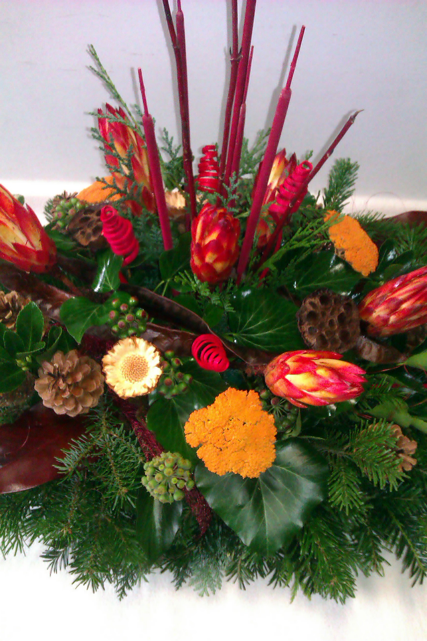 Taký nevídaný QIETOK » Kytice » Aranžmány » Taký nevídaný Rozložitý oválny príležitostný aranžmán s dĺžkou cca 90-100 cm v jesennej farebnosti so zeleným základom z čečiny Abies a Hedera s farbenými Protea, listami magnólie, šiškami, červenými špirálkami, Gleditsia a súkvetiami Achillea. Cena: 40,00 € Aktualizujem fúrik... Akutalizujem...