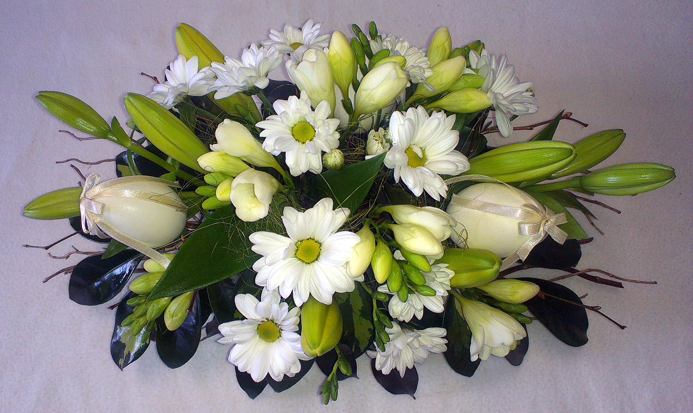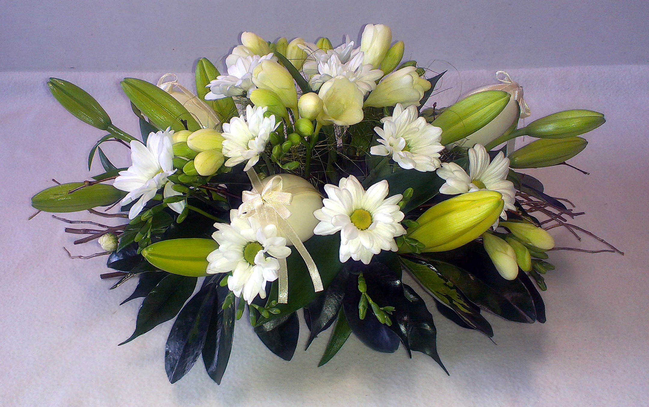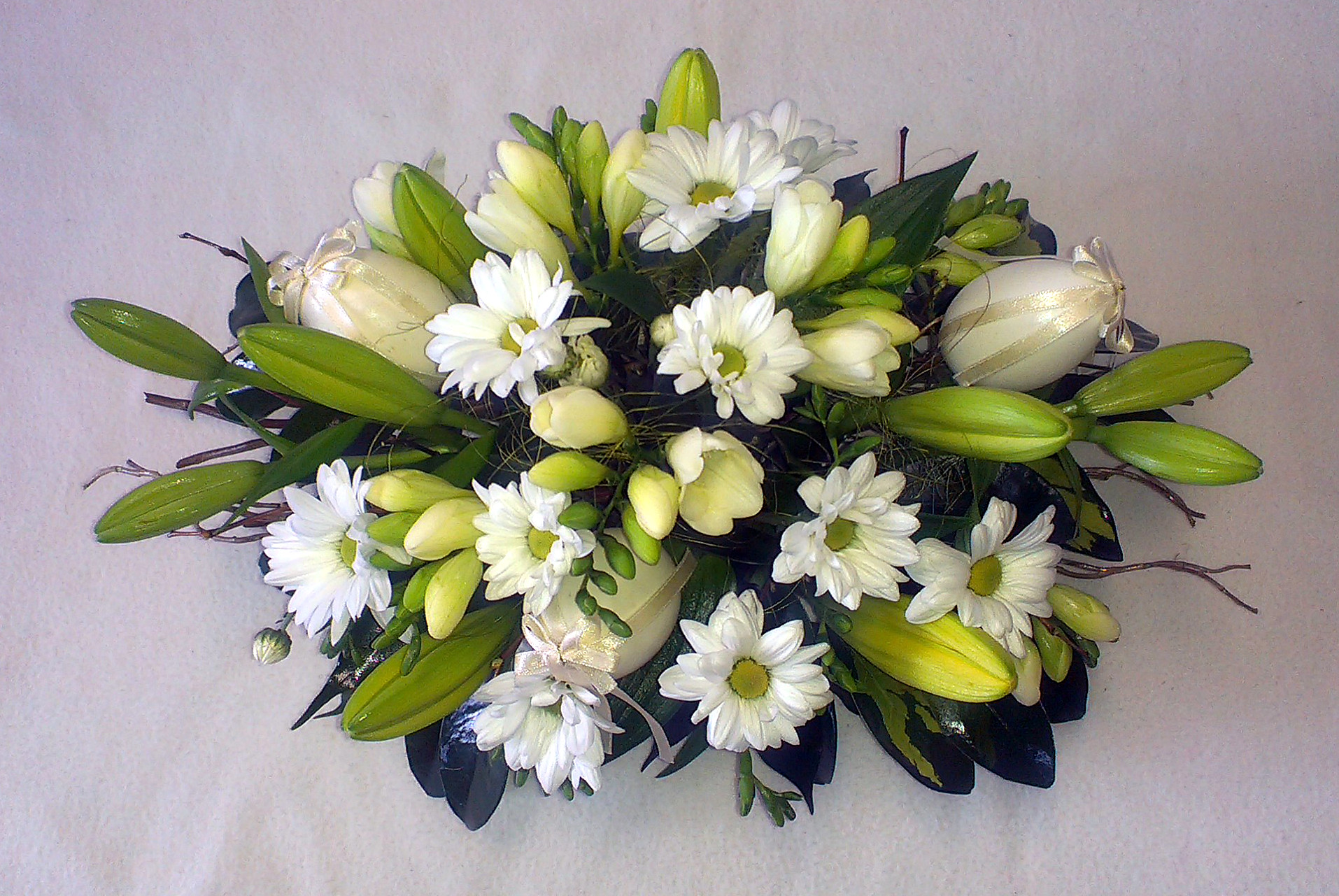 Veľkonočná nedeľa QIETOK » Kytice » Aranžmány » Veľkonočná nedeľa Jarný vypichovaný aranžmán z bielych Freesia, žltých ľalií, „margerétkových“ chryzantém, halúzok Tilia a Salix a listov Schefflera. Cena: 30,00 € Aktualizujem fúrik... Akutalizujem...