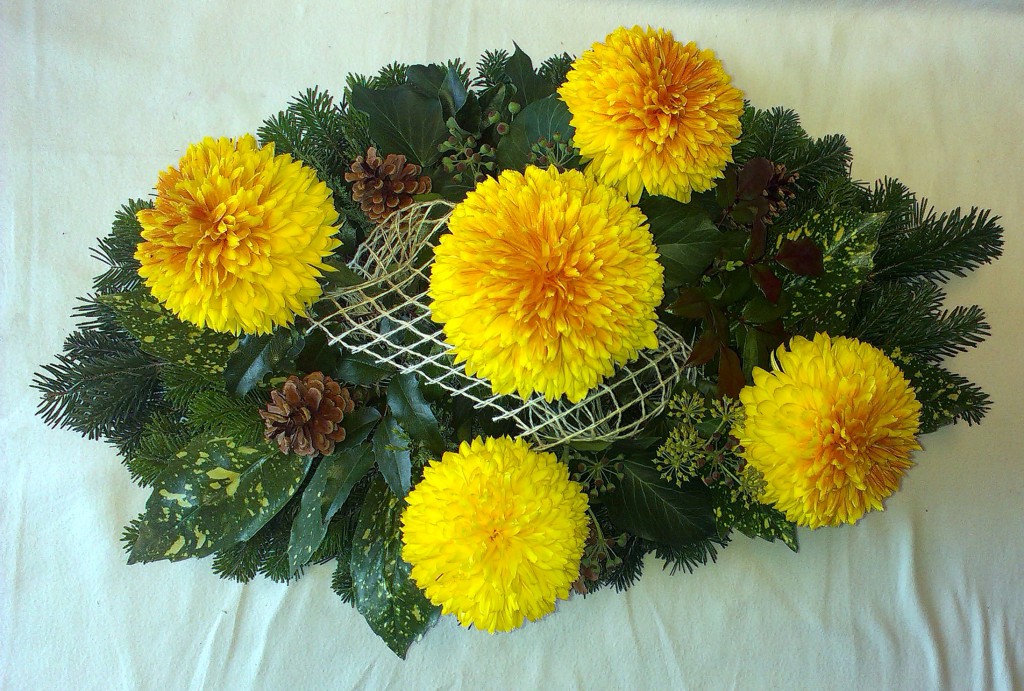 Oválny aranžmán so žltooranžovými chryzantémami QIETOK » Kytice » Aranžmány » Oválny aranžmán so žltooranžovými chryzantémami Oválny príležitostný aranžmán z čerstvej jedľovej čečiny s listami Hedera a Aucuba, so šiškami, žltooranžoými veľkokvetými chryzantémami a jemnou sieťovanou stuhou. Cena: 26,00 € Aktualizujem fúrik... Akutalizujem...