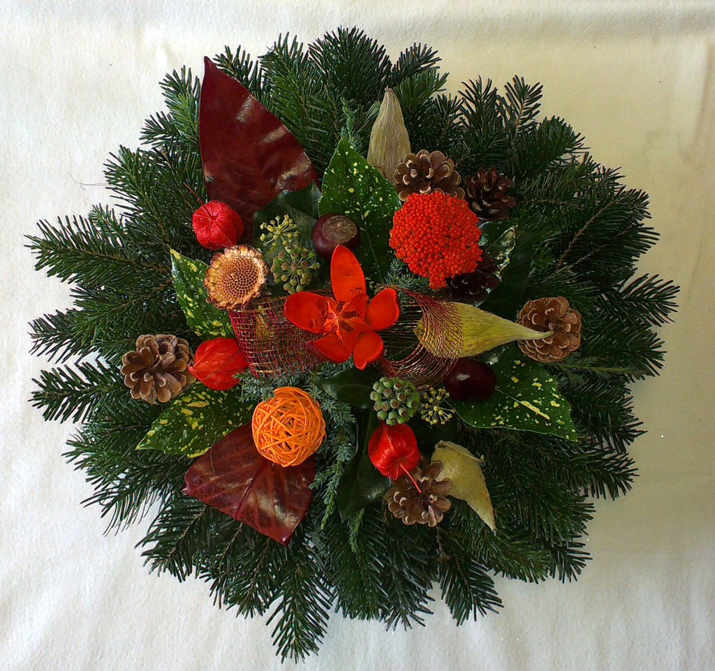 Oranžovobordový okrúhly aranžmán QIETOK » Kytice » Aranžmány » Oranžovobordový okrúhly aranžmán Výrazný oranžovobordový okrúhly aranžmán z čerstvej čečiny Abies s listami Aucuba a Hedera, bordovými sušenými listami Achillea, „Wildlilien“ a ďalším prírodným materiálom. Cena: 24,00 € Aktualizujem fúrik... Akutalizujem...