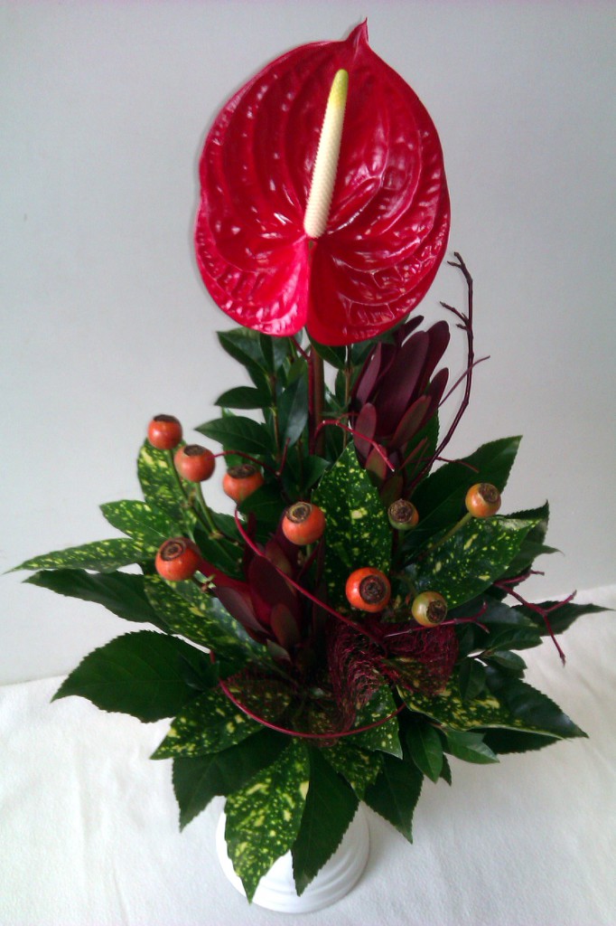Červená svieca QIETOK » Kytice » Kytice » Gratulačné » antúriami » Červená svieca Antúria „Tropical“ je najvýraznejším prvkom v kytici zloženej z bordových Leucadendron a plodov Rosa vnorených medzi halúzkami Cornus a zeleňou Aucuba, Aralea a Ligustrum. Cena: 27,00 € Aktualizujem fúrik... Akutalizujem...