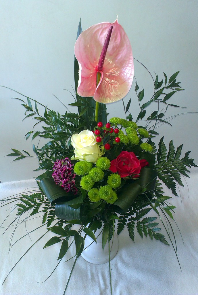 Mamamia QIETOK » Kytice » Kytice » Gratulačné » antúriami » Mamamia Pozoruhodné farebné a tvarové spojenie ružovej Anthuria, bielej ruže „Avalanche“, bordovej ruže, zelenkavej trsovej chryzantémy „Santini“, Dianthus barbatus so zeleňou Ruscus a Rumohra. Cena: 38,00 € Aktualizujem fúrik... Akutalizujem...