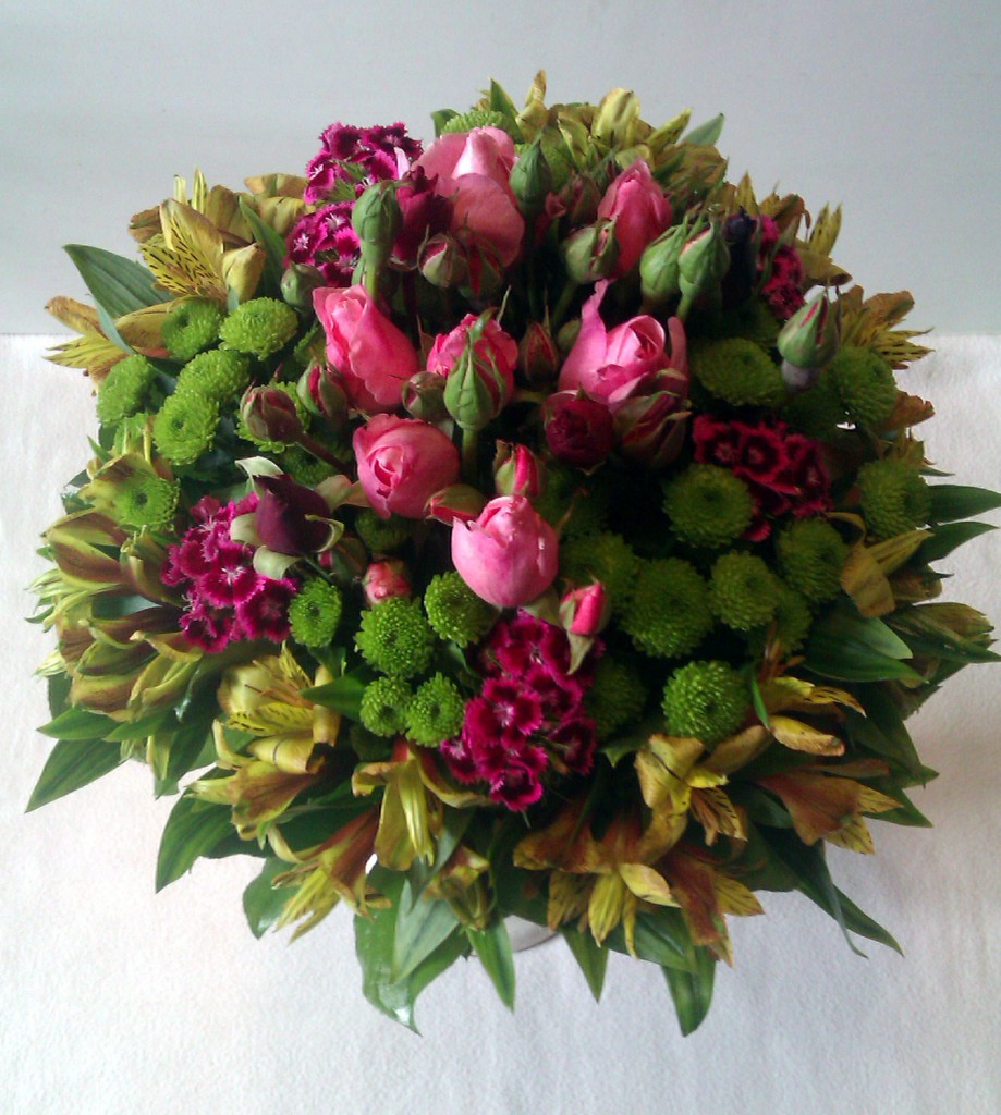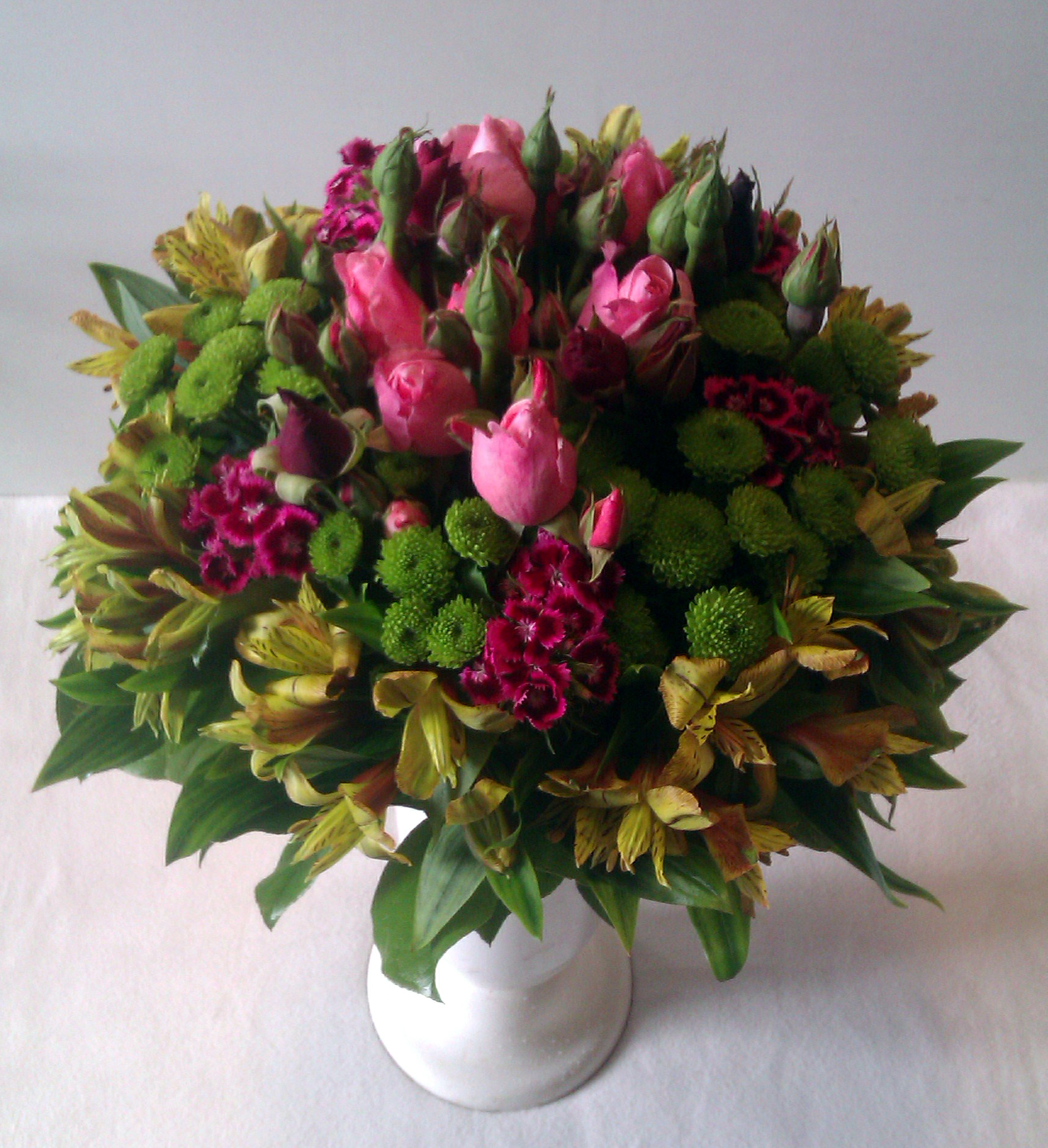 Letná emócia QIETOK » Kytice » Kytice » Gratulačné » chryzantémami » Letná emócia Honosná guľatá v ruke viazaná kytica z ružových trsových a červených ruží, cyklámenovoružových Dianthus barbatus, zelenkavých chryzantém „Santini“ a žltobordových Alstroemeria, ktoré lemujú lístky Salal. Cena: 45,00 € Aktualizujem fúrik... Akutalizujem...