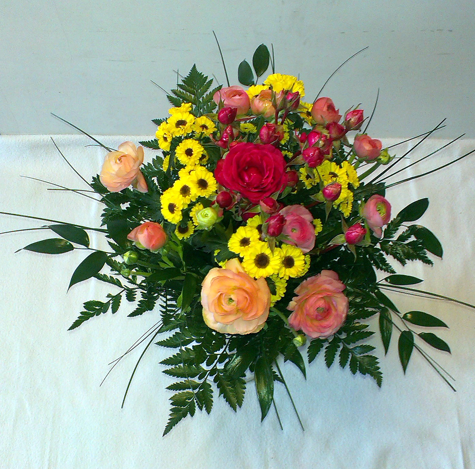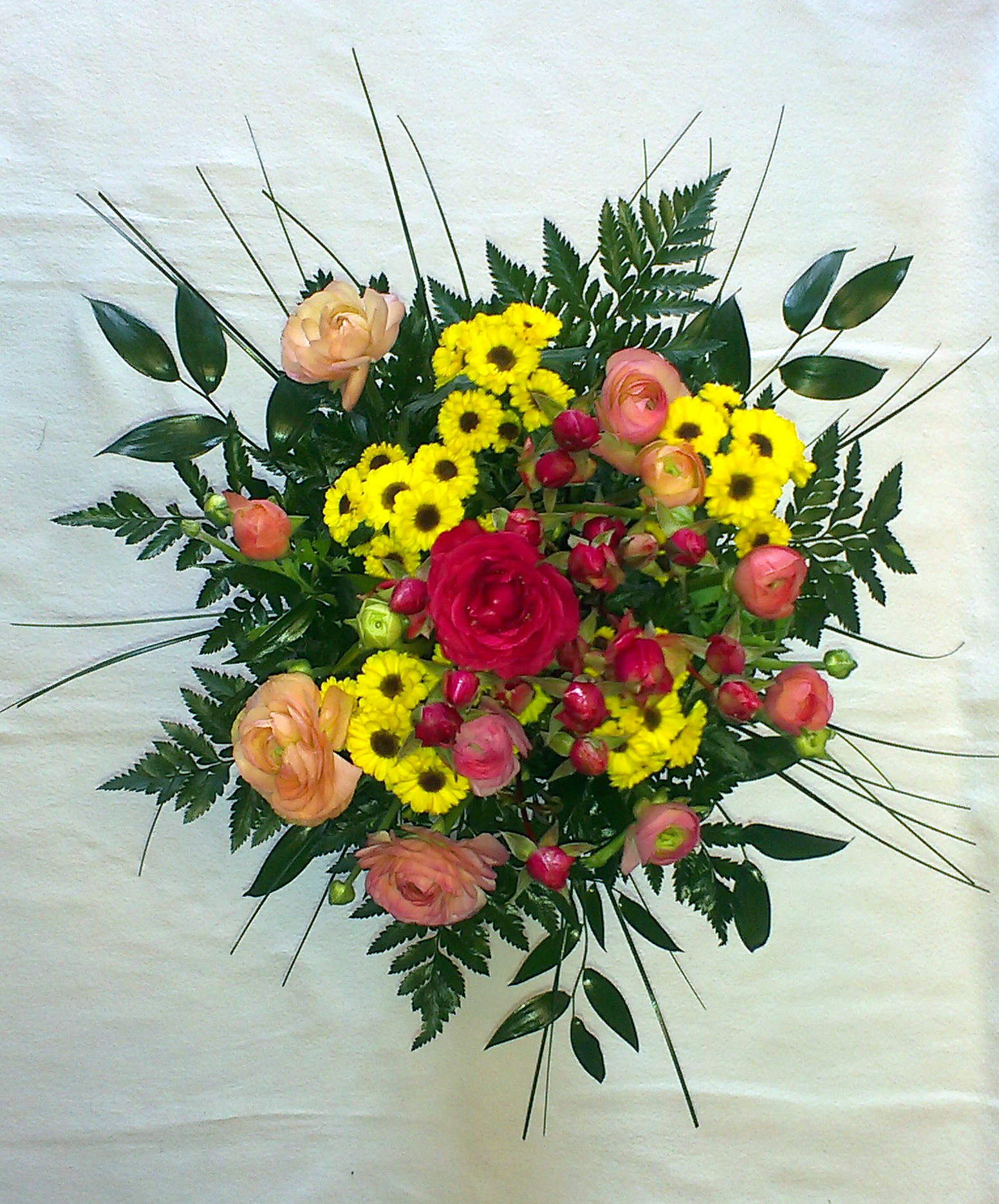 Farebná manéž QIETOK » Kytice » Kytice » Gratulačné » chryzantémami » Farebná manéž Pestrá strapatá kytica poskladaná z ružovooranžových Ranunculus, drobných žltých chryzantém „Santini“, ružovočervených trsových ruží a sviežej zelene Ruscus a Beargrass. Cena: 42,00 € Aktualizujem fúrik... Akutalizujem...