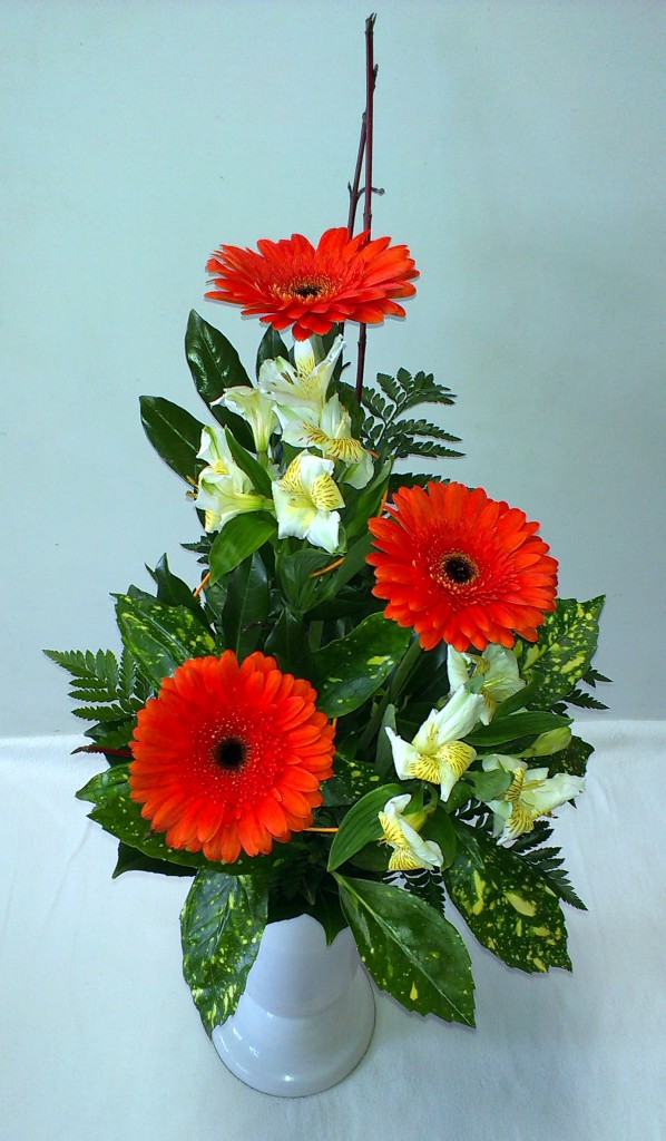 Jasnočervené gerbery a krémovožlté alstromérie tvoria príjemné spojenie, ktorého zaujímavosť podčiarkujú škvrnité žltozelené listy Aucuba, Rumohra, Prunus a oranžový „pedig“.