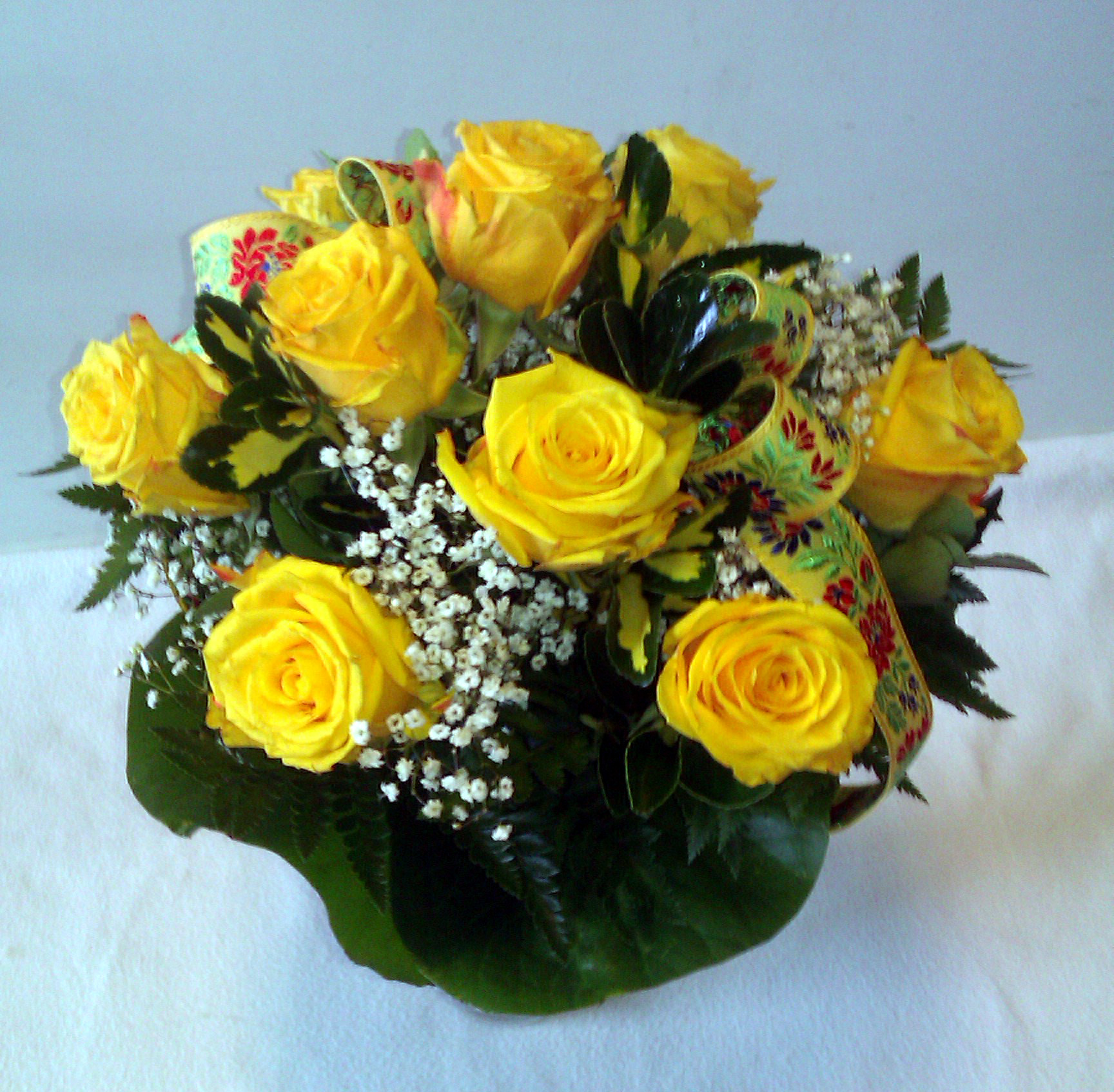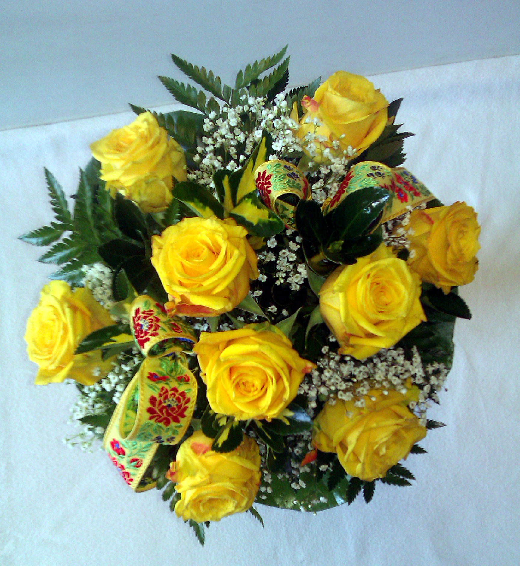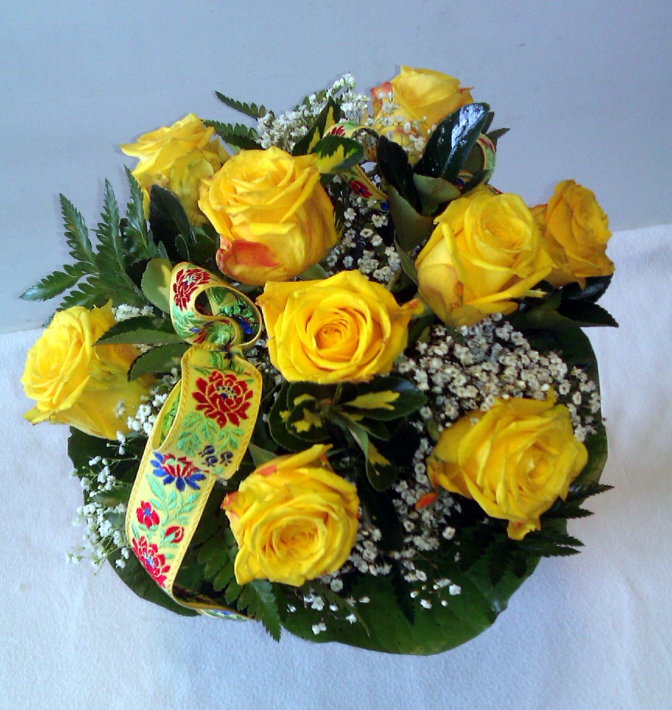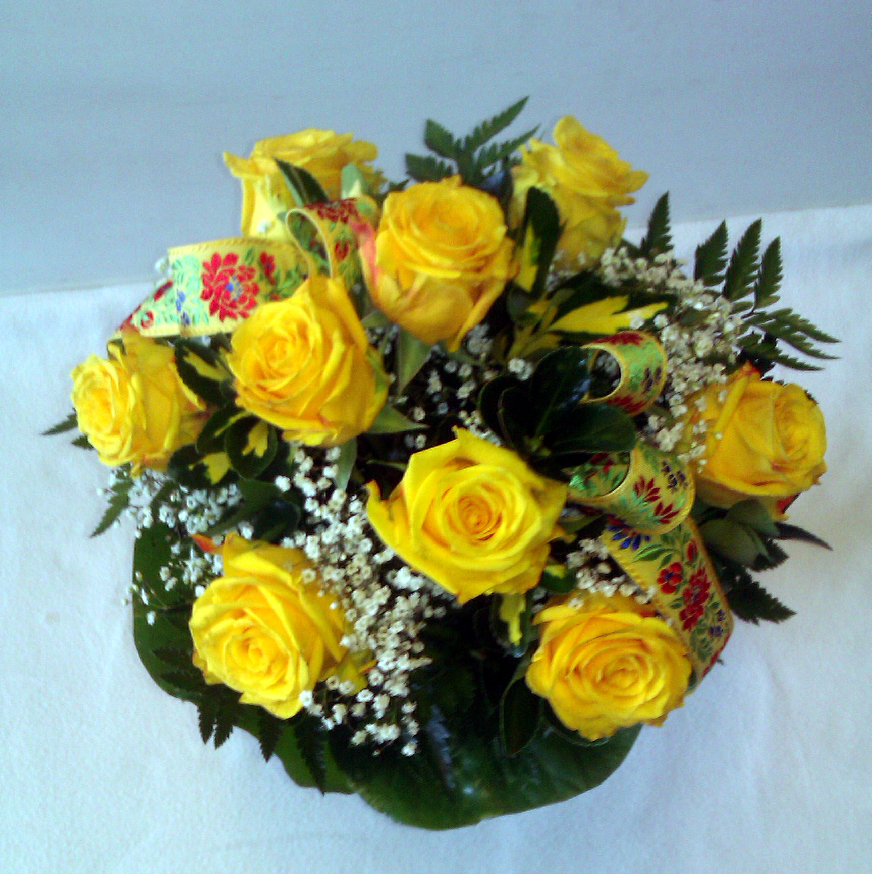 Žltá deviatka QIETOK » Kytice » Kytice » Gratulačné » Žltá deviatka Jednoduchá okrúhla kytica zo žltých ruží s vyšívanou slovenskou stuhou, drobnými kvietkami Gypsophila. Cena: 39,00 € Aktualizujem fúrik... Akutalizujem...