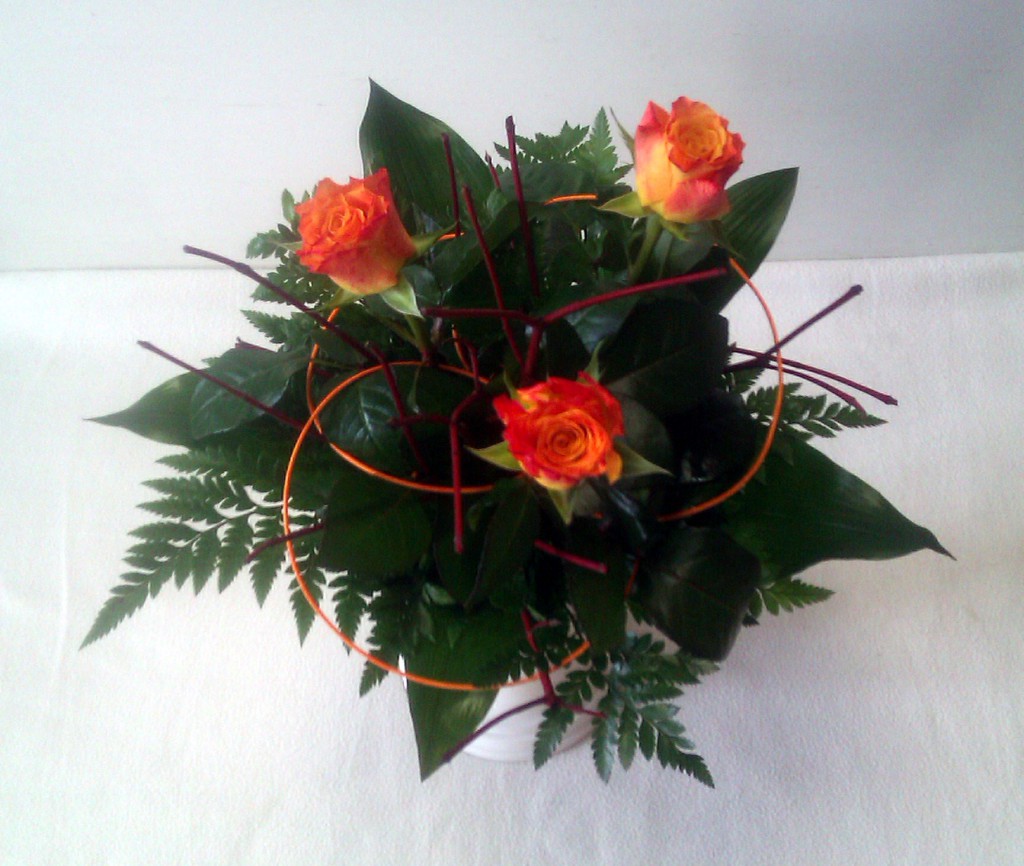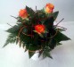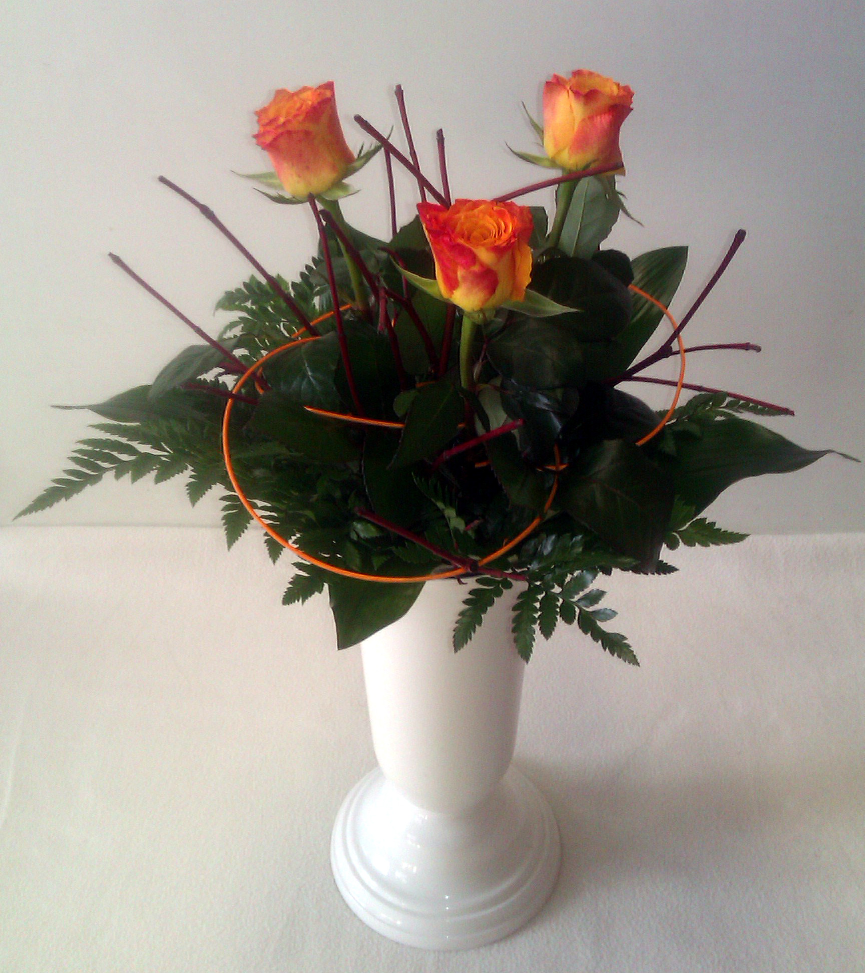 Malá jednoduchá kytička z troch oranžovožltých ruží „Marie-Claire“, listov Rumohra Aspidistra, ktoré sú prepletené vetvičkami Cornus  a oranžovými pásikmi „pedigu“.