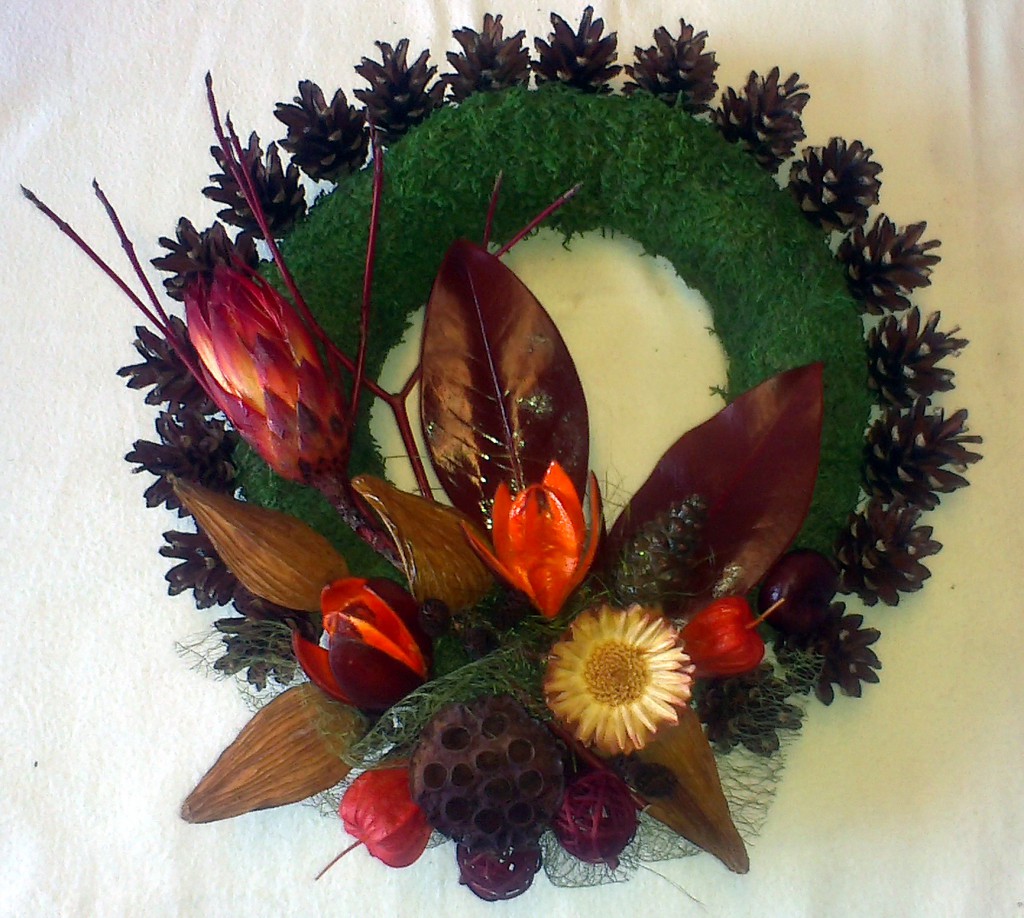 Bordovooranžový machový veniec QIETOK » Kytice » Vence » Príležitostné » Bordovooranžový machový veniec Bohatý veniec z machu a šišiek, zdobený výhradne prírodnými materiálmi ako farbená krémovohnedá Protea, Physalis, Cornus, sušené listy a plody. Cena: 20,00 € Aktualizujem fúrik... Akutalizujem...