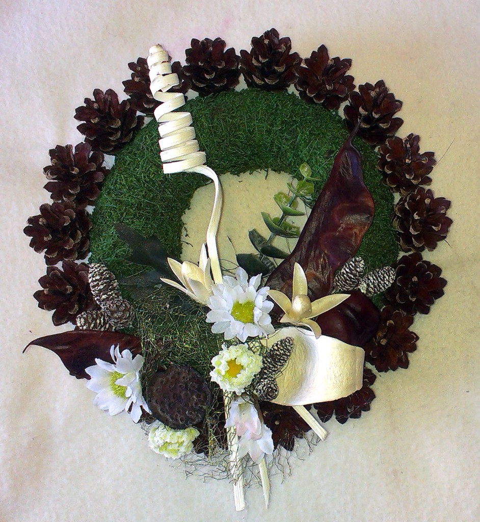 Bielohnedý machový veniec QIETOK » Kytice » aranzmany-velkonocne-vyradene » Bielohnedý machový veniec Malý venček so základom z machu a šišiek, s ϕ 20 cm, ozdobený bielymi látkovými kvetmi, plodmi gledíčie, gaštanmi, sušenými exotickými plodmi a bielou špirálou. Cena: 13,00 € Aktualizujem fúrik... Akutalizujem...