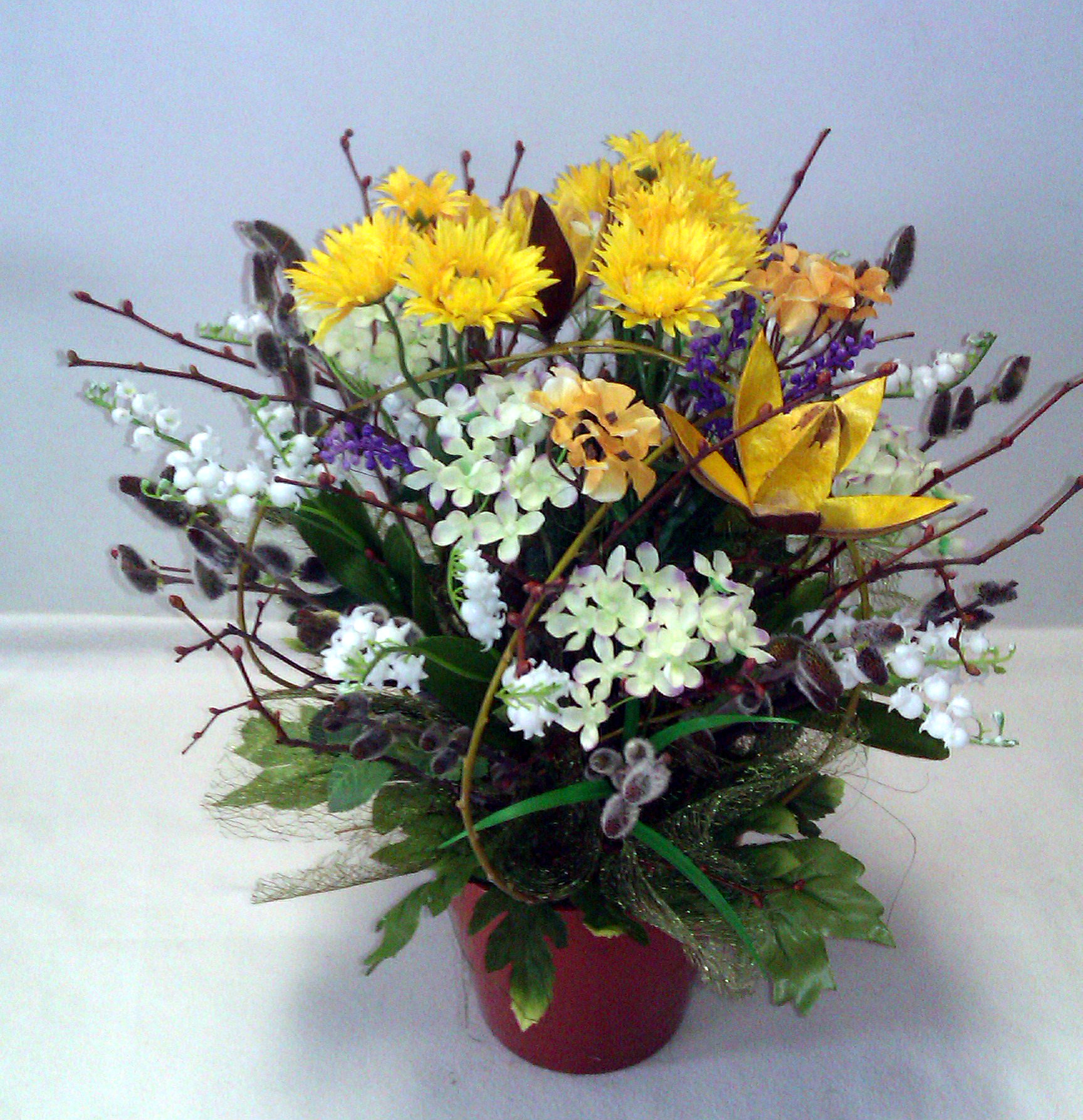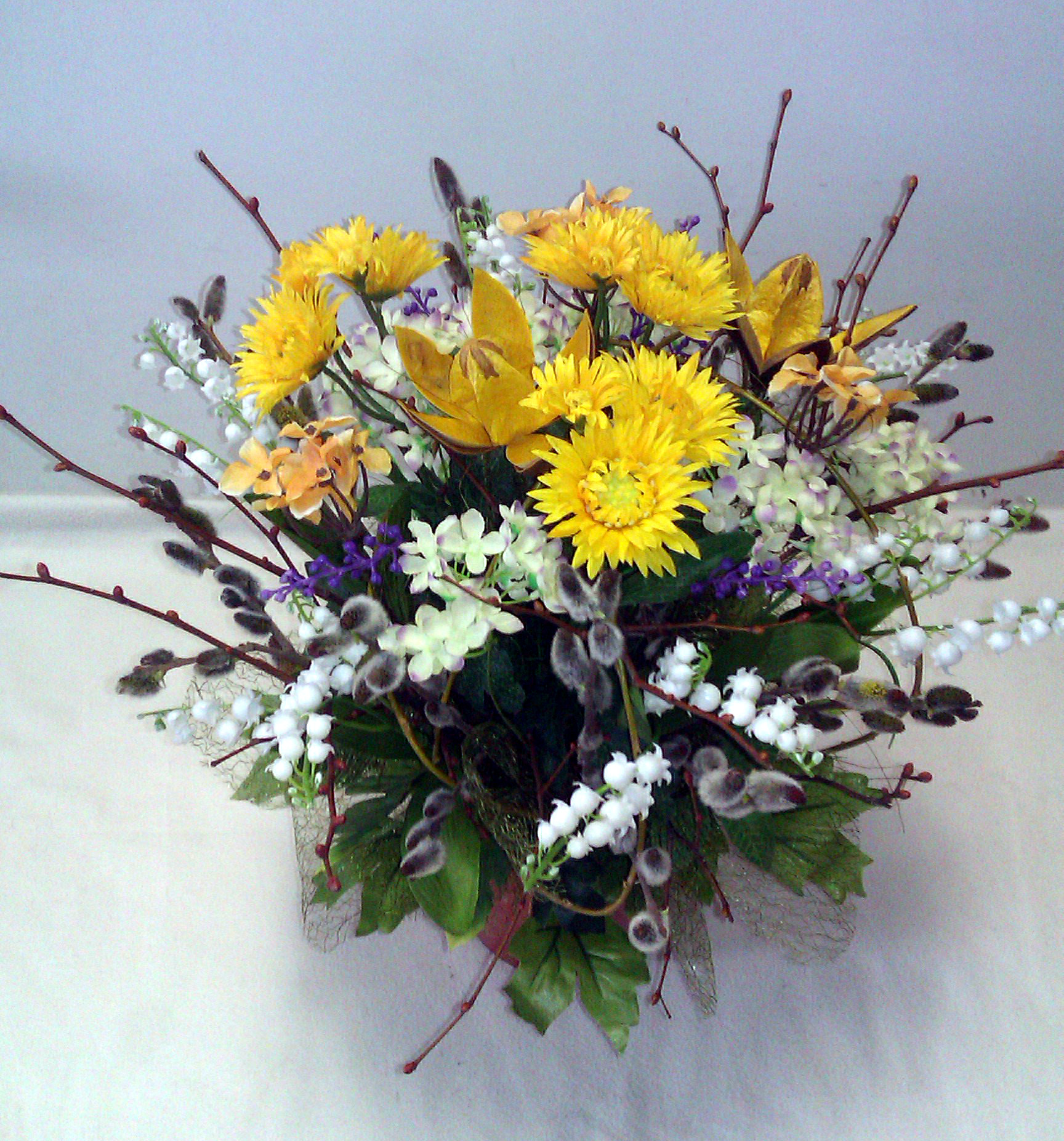 Pestrý jarný aranžmán z rôznych halúzok,  rozkvitnutej vŕby, látkových kvetov, „Wildlilien“, sisalu a zelenkavej „pavučiny“.
