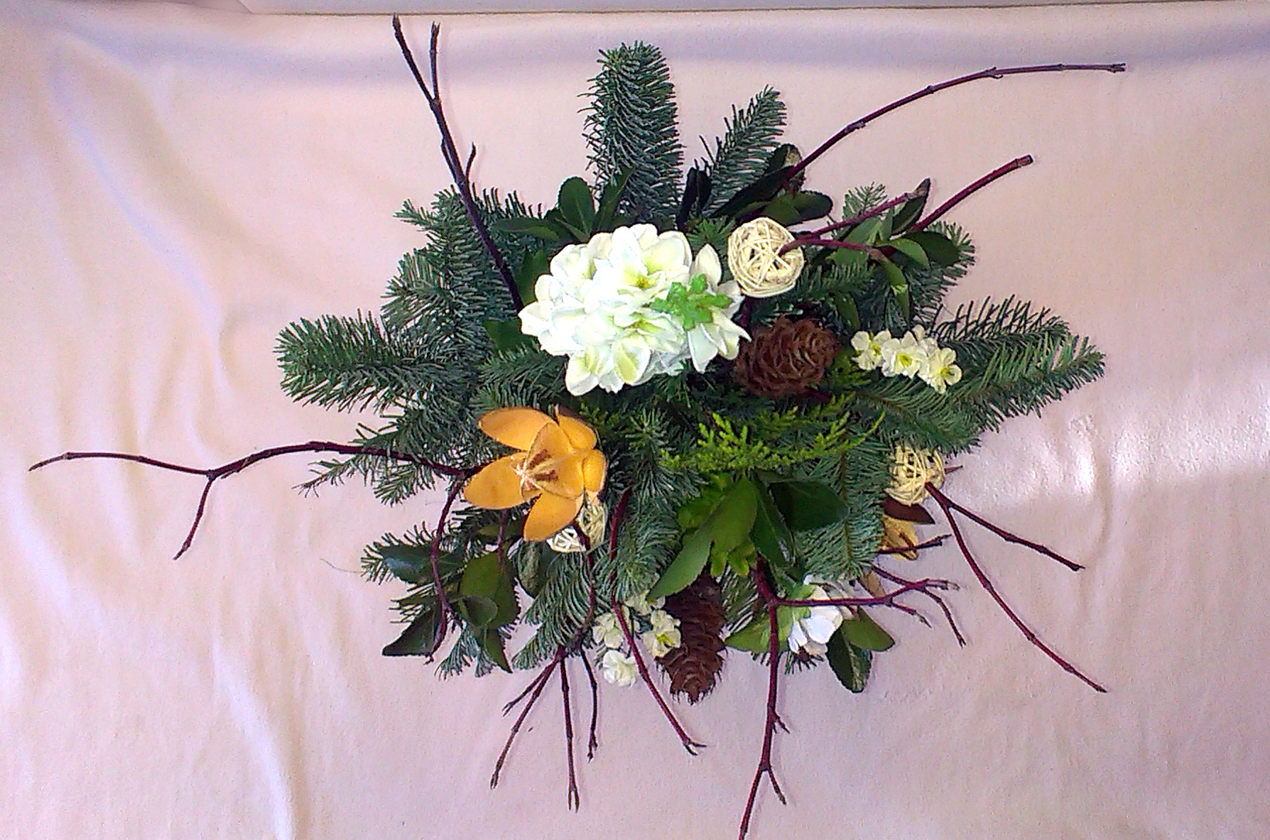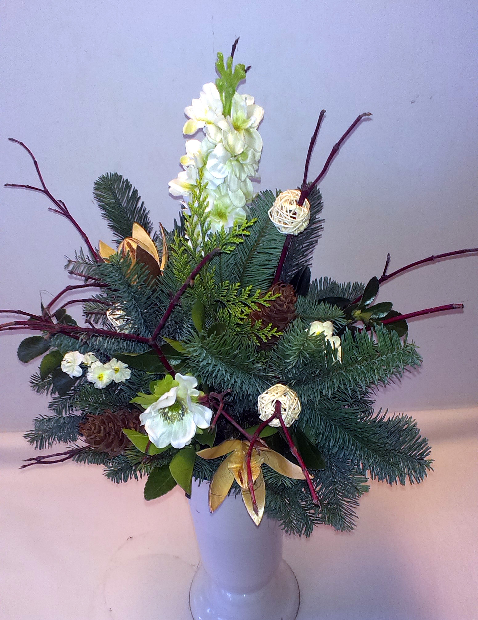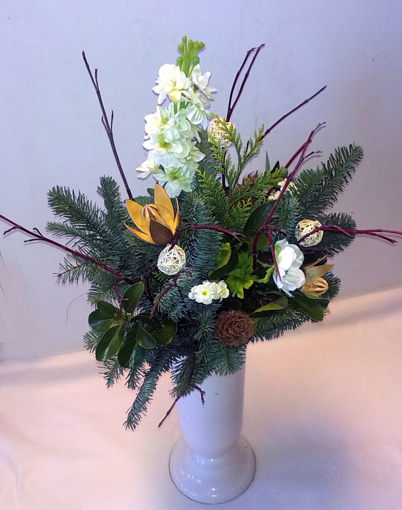 Nástup zimy QIETOK » Kytice » Sušené kvety » Nástup zimy Kombinovaná kytica z prírodných sušených a živých materiálov a látkových kvetov. Dominantným kvetom je bohaté biele Delphinium, doplnené bielymi Anemone a prírodnými „Wildlilien“ umiestnenými medzi halúzkami Cornus, Abies a Euonymus. Cena: 24,00 € Aktualizujem fúrik... Akutalizujem...